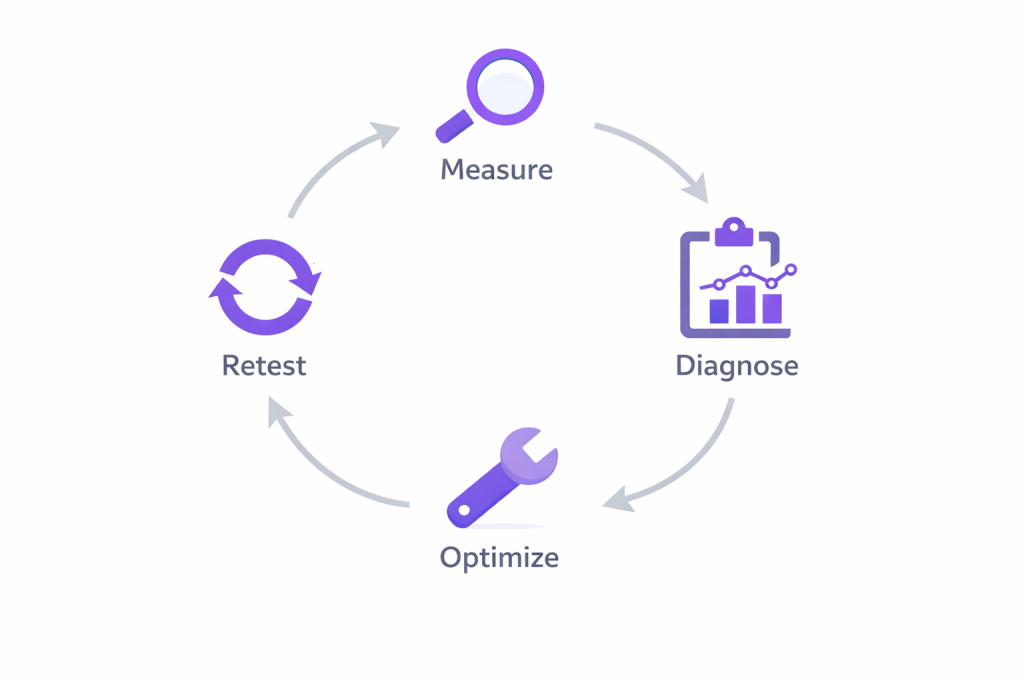 A simple rhythm helps keep progress visible: measure, diagnose, optimize, retest. Repeat it quarterly to track whether visibility changes correspond with updates you’ve made.