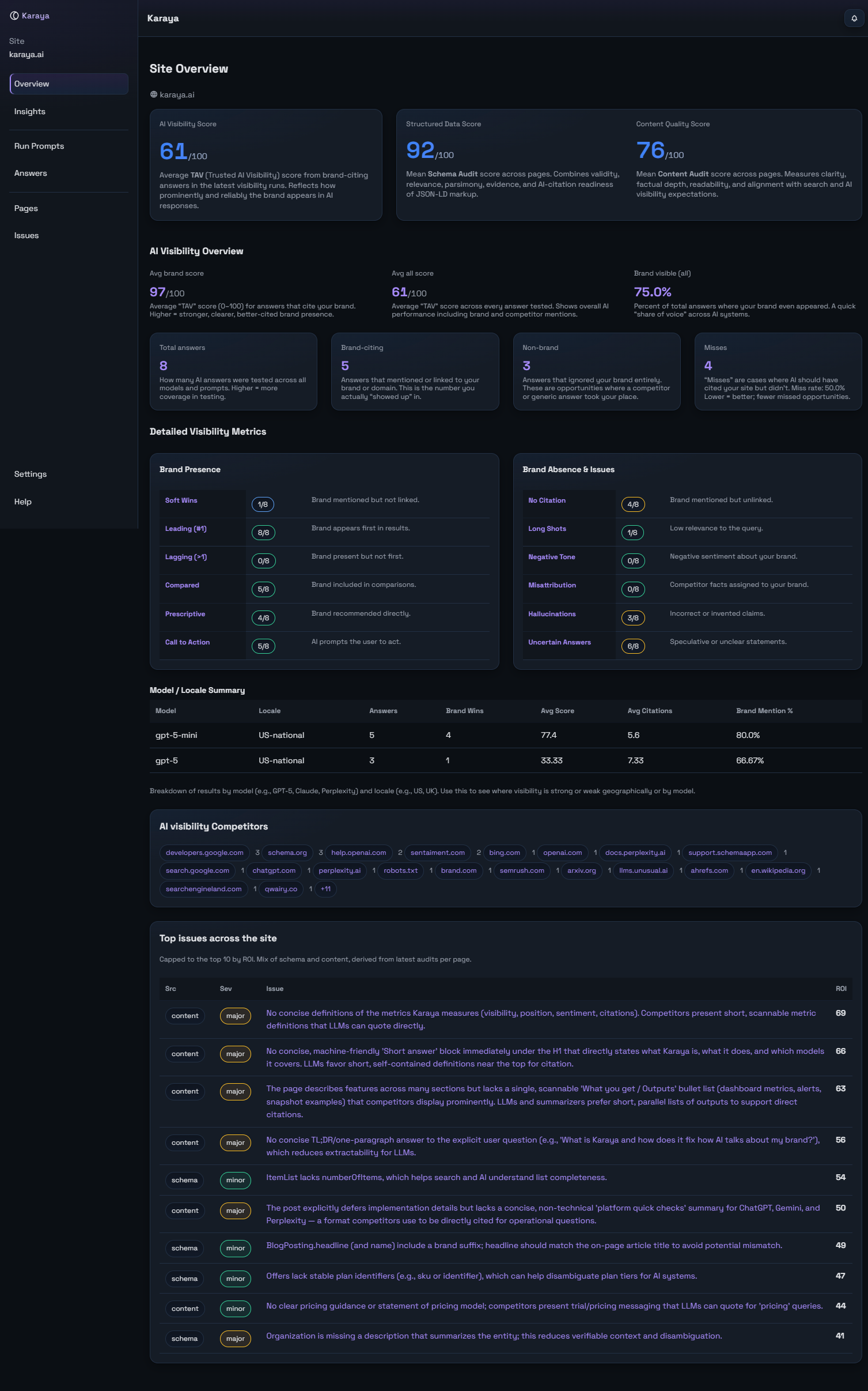 A unified dashboard for tracking mentions, citations, and trust signals across models.