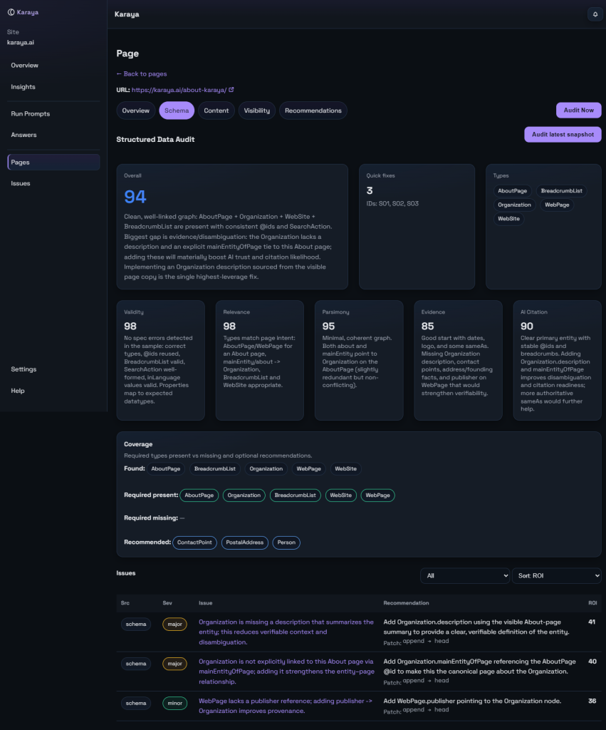 Karaya validates your structured data and highlights missing or conflicting schema so AI systems can confidently understand and cite your brand.